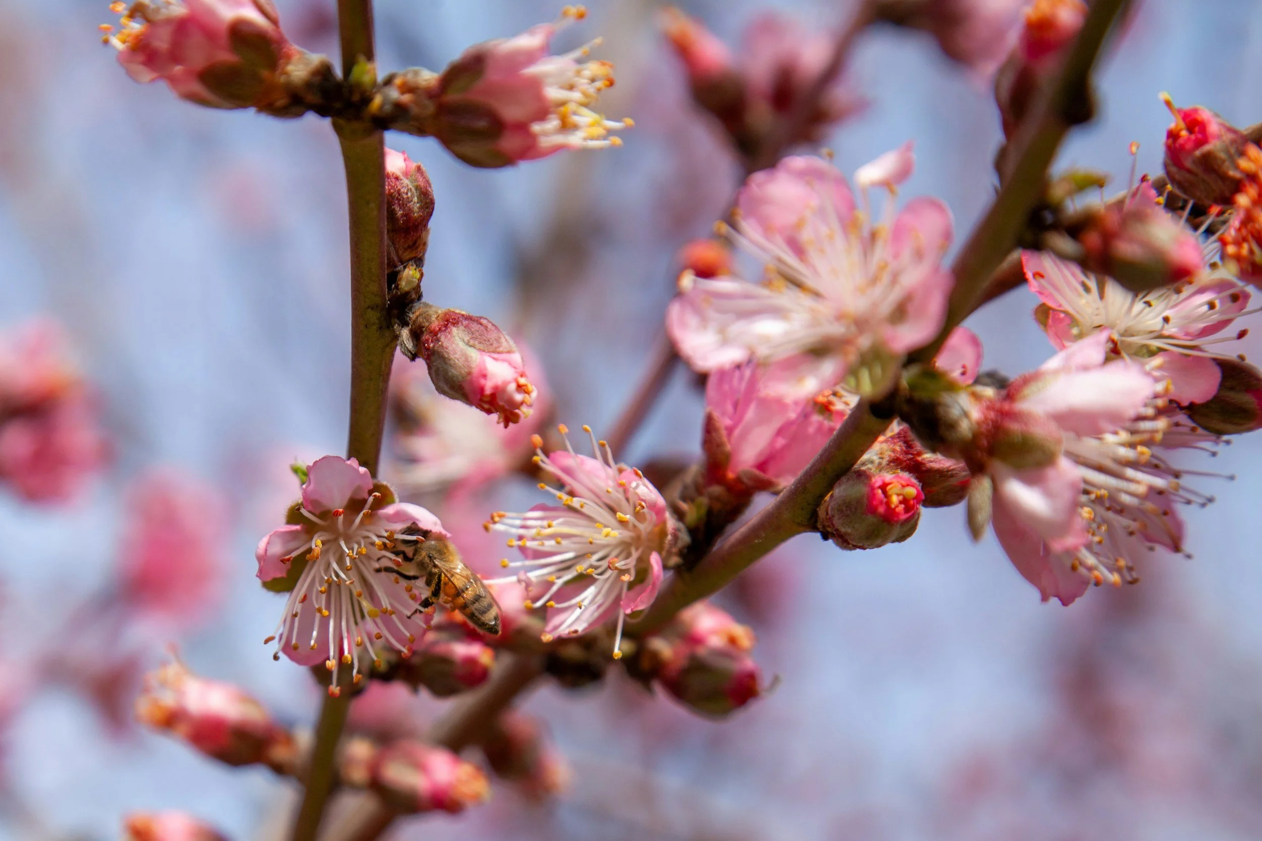 A bee resting on a blossom.